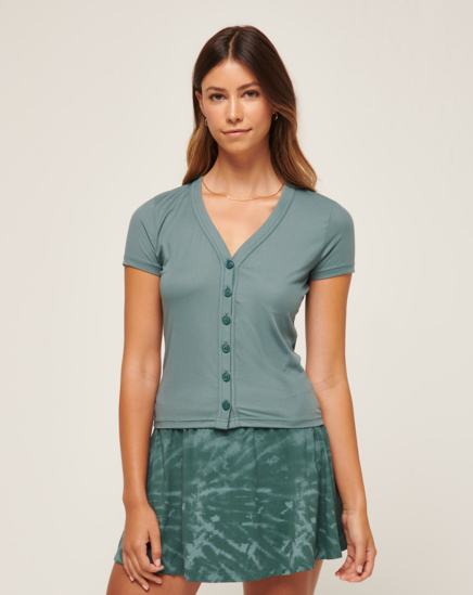 The slim-fitting BUTTERFLY BEACH top is made to flatter. Featuring center-front buttons and a ribbed fabric, this on-and-off-the-course style skims the body while delivering total comfort and superior mobility. Short sleeve button-down top Fitted styleV-neckline 6-button placketQuick dry fabric UPF ...